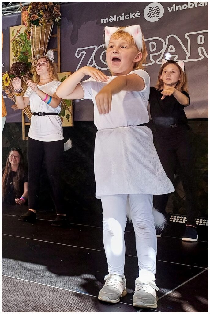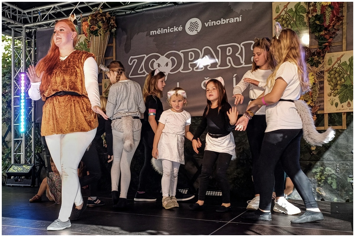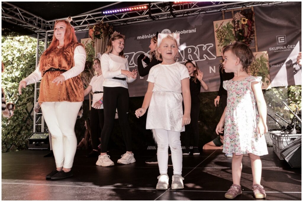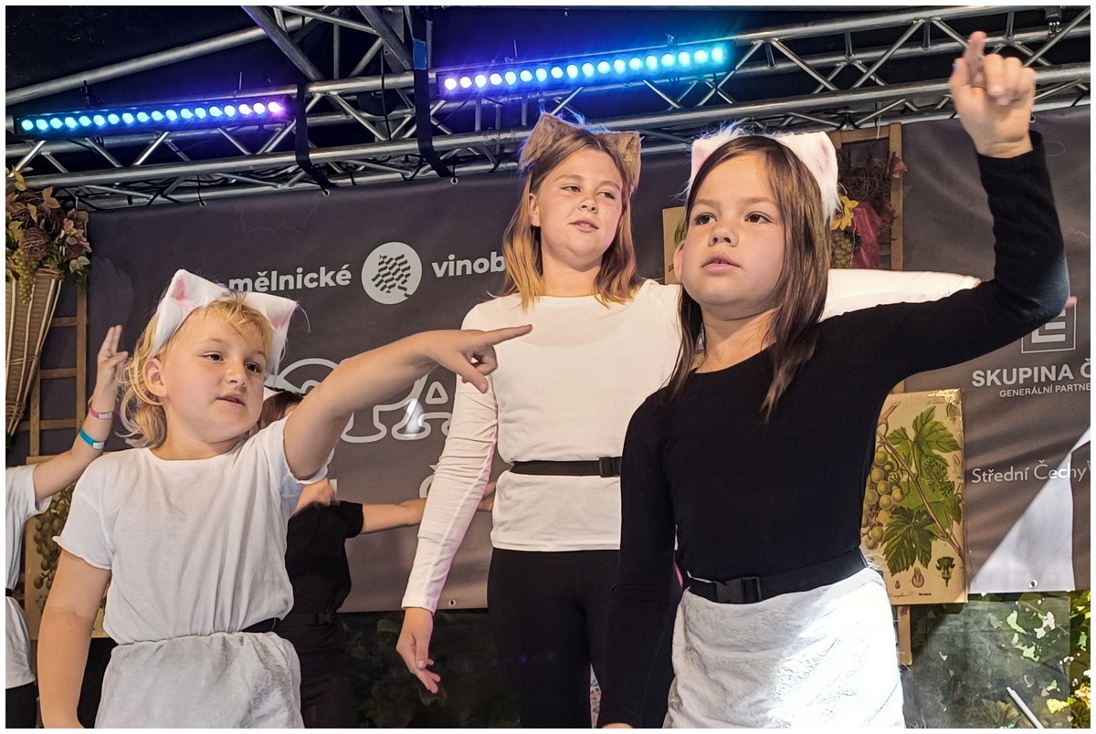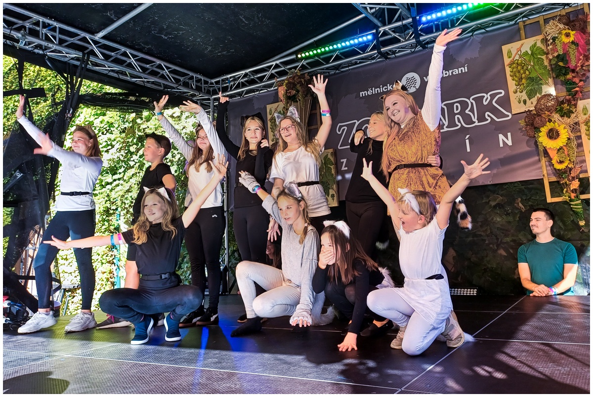Vystoupení dětí z připravovaného muzikálu Kocourek Modroočko na Zámecké scéně Mělnického vinobraní.